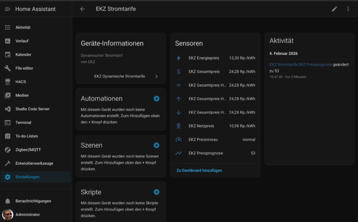 Mit dieser Integration lassen sich die dynamischen EKZ-Stromtarife einfach in Home Assistant einbinden. Die Automatisierungsmöglichkeiten sind vielfältig – vom E-Auto über die Wärmepumpe bis zur Waschmaschine kann der Stromverbrauch intelligent in günstige Zeitfenster verschoben werden.