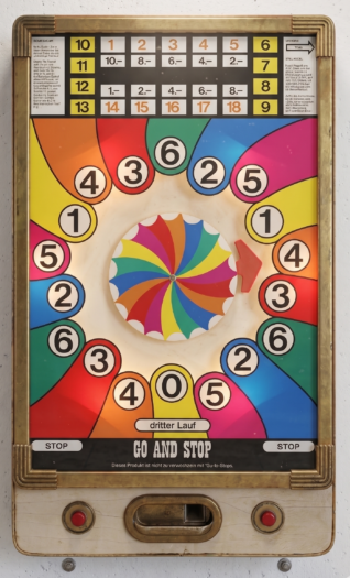 In der Eingangshalle der Villa Wellentanz hängt ein Spielautomat aus den späten 1960er- oder frühen 1970er-Jahren. «Go and Stop» heisst er. Wer eine Münze einwirft, setzt einen roten Pfeil in Bewegung, der sich dreimal über ein Regenbogenrad dreht. Mit zwei Stop-Tasten links und rechts kann man ihn anhalten. Ziel: in drei Läufen entweder 1–5 Punkte oder 14–18 Punkte erreichen. Alles dazwischen ist eine Niete.